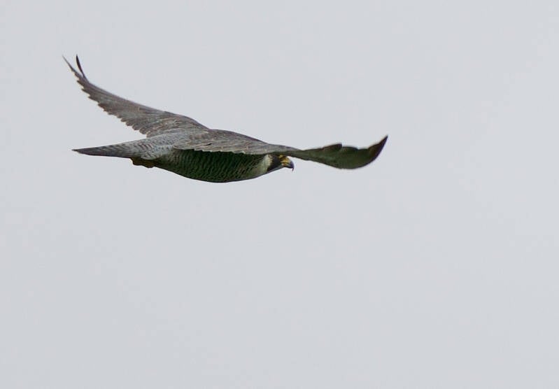 Driemanspolder : De geringde jonge vrouw Slechtvalk met de gehavende staart scheurt op topsnelheid voorbij....: