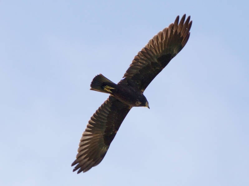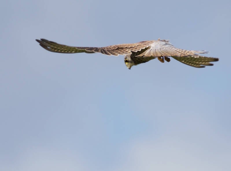Hij draait zoals gewoonlijk wat rondjes voordat hij in een lange glijvlucht afdaalt richting broedbos.