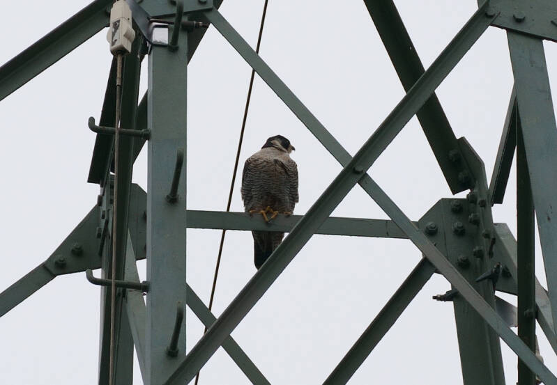 -Vanaf het Bernard viaduct in het Centrum van Den Haag is een Valk te zien op een zendmast naast het spoor..: