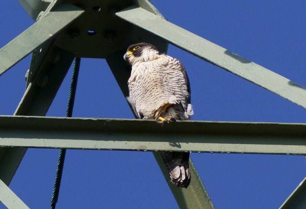 Hij toont nog deels het jeugdkleed, maar gezien de al zeer witte wangetjes is het een Valk van waarschijnlijk zo'n 13 maanden oud :