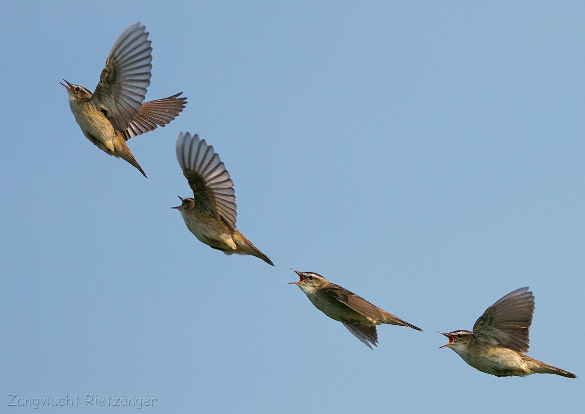 Rietzangers zingen niet alleen zittend, maar maken op gezette tijden ook een fraaie zangvlucht :