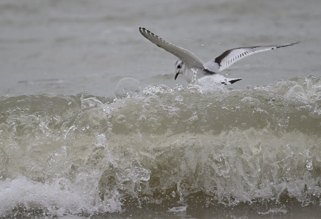 zich maar liefst 3 kwartier foeragerend liet bekijken in de branding.......(39 foto's en 4K-video van de Dwergmeeuw)