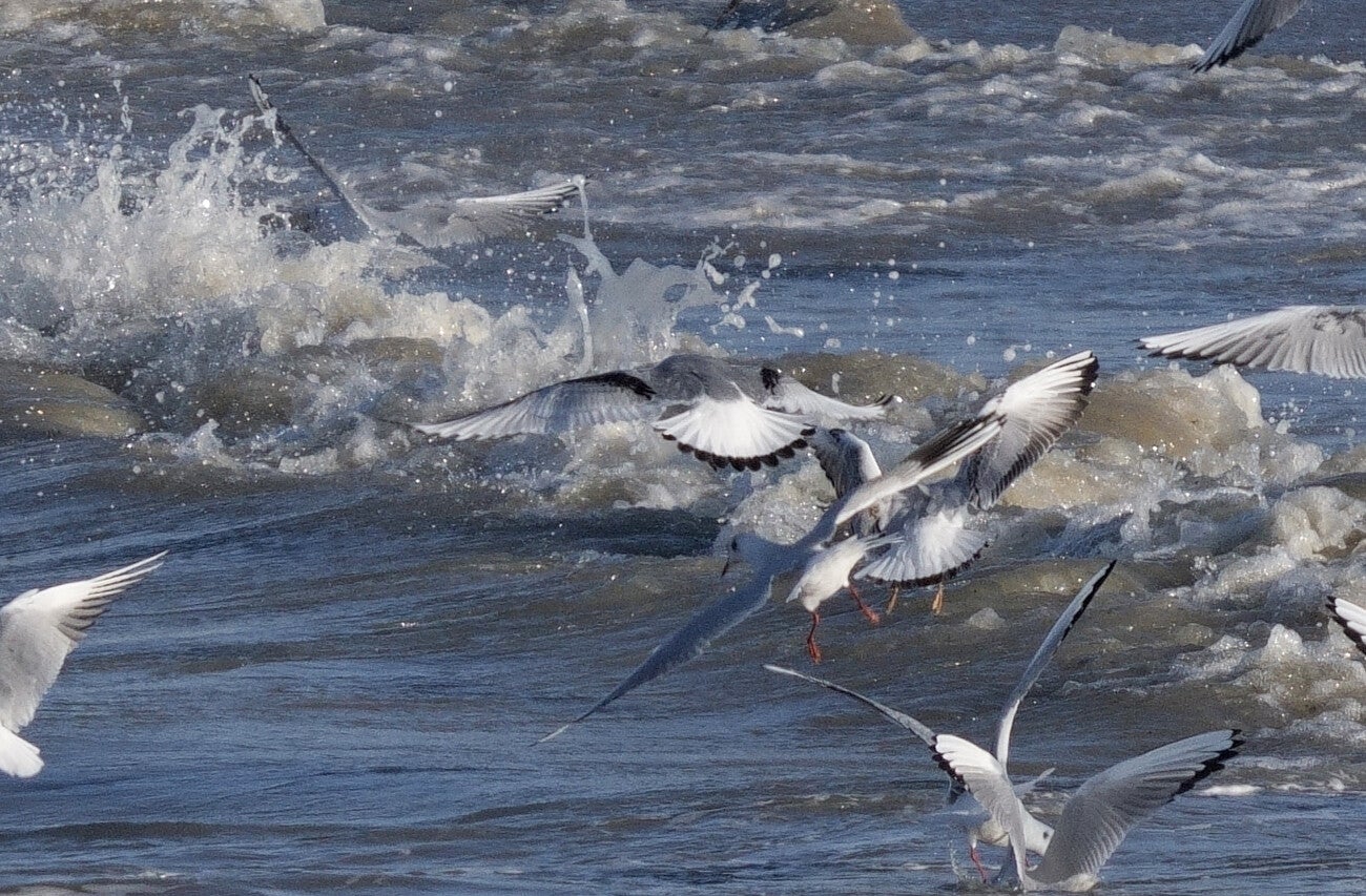 Op zee nog steeds de foeragerende Kokmeeuwen, er zaten vandaag 2 Drieteenmeeuwen tussen.