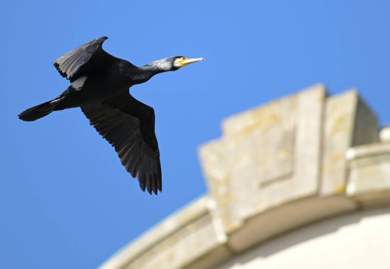Hierna is er een paar uur niets te zien, heel soms vliegen er andere vogels voorbij, zoals deze Aalscholver...: