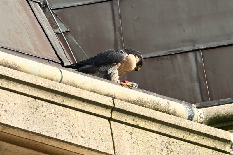 Alo op de richel met een uit de opslag getoverde prooi.