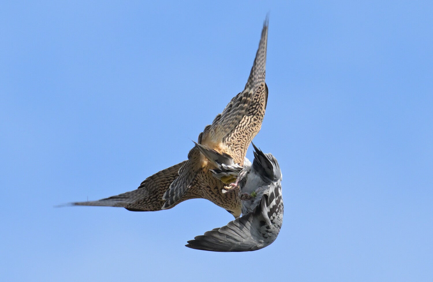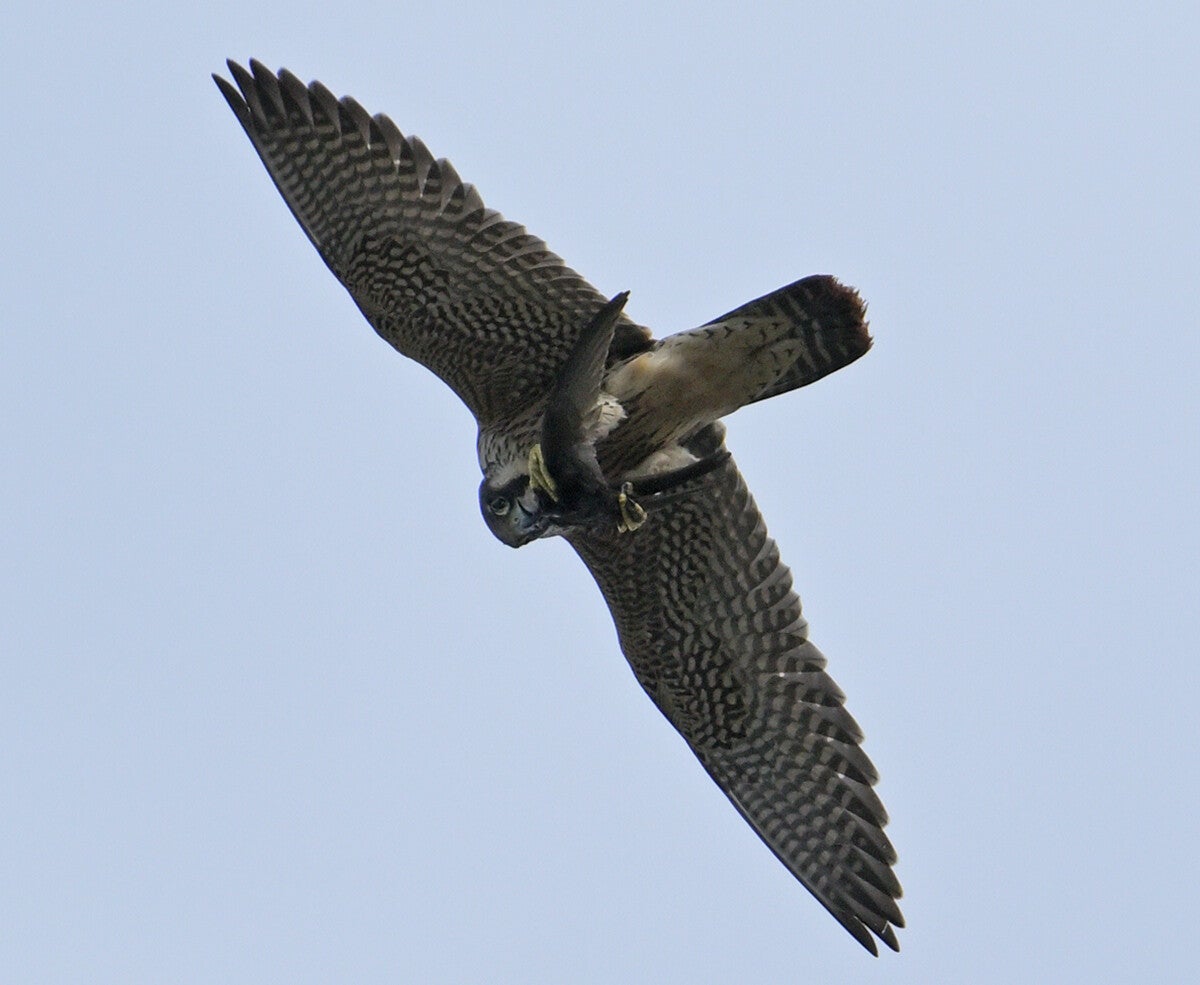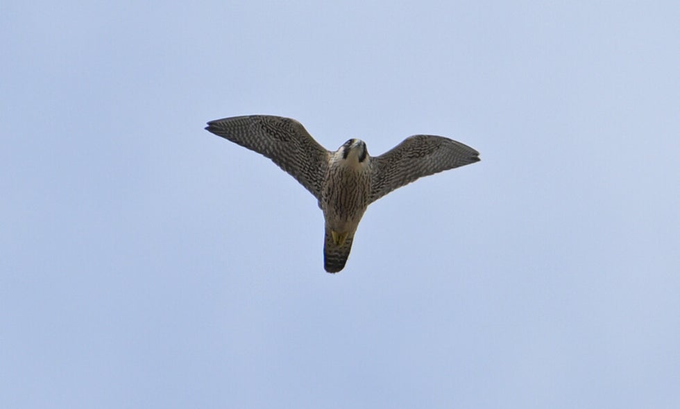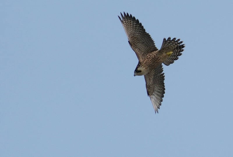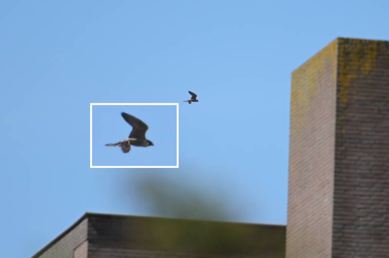 Een jonge Slechtvalk ving boven het verboden Dunea terrein een insect uit het vuistje. Wie goed kijkt kan nog net 2 vleugels onderscheiden