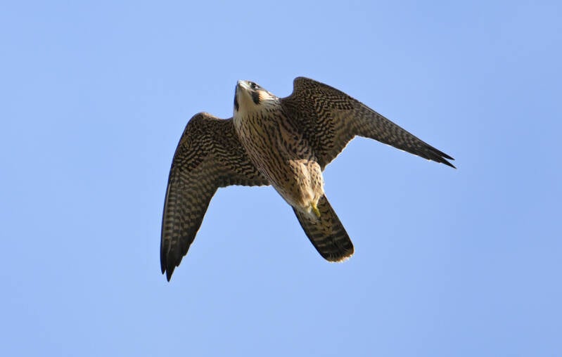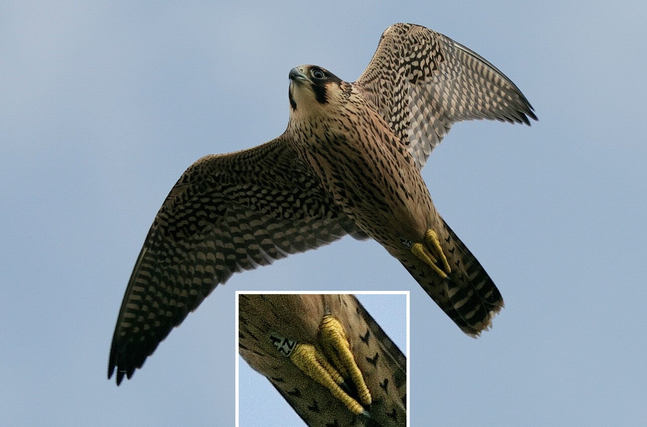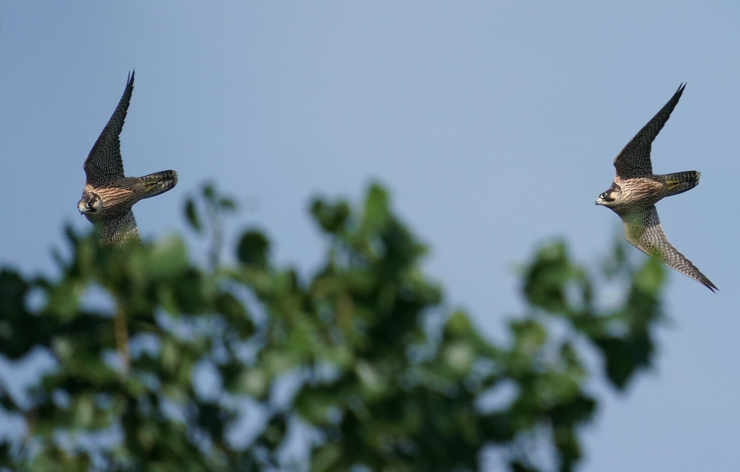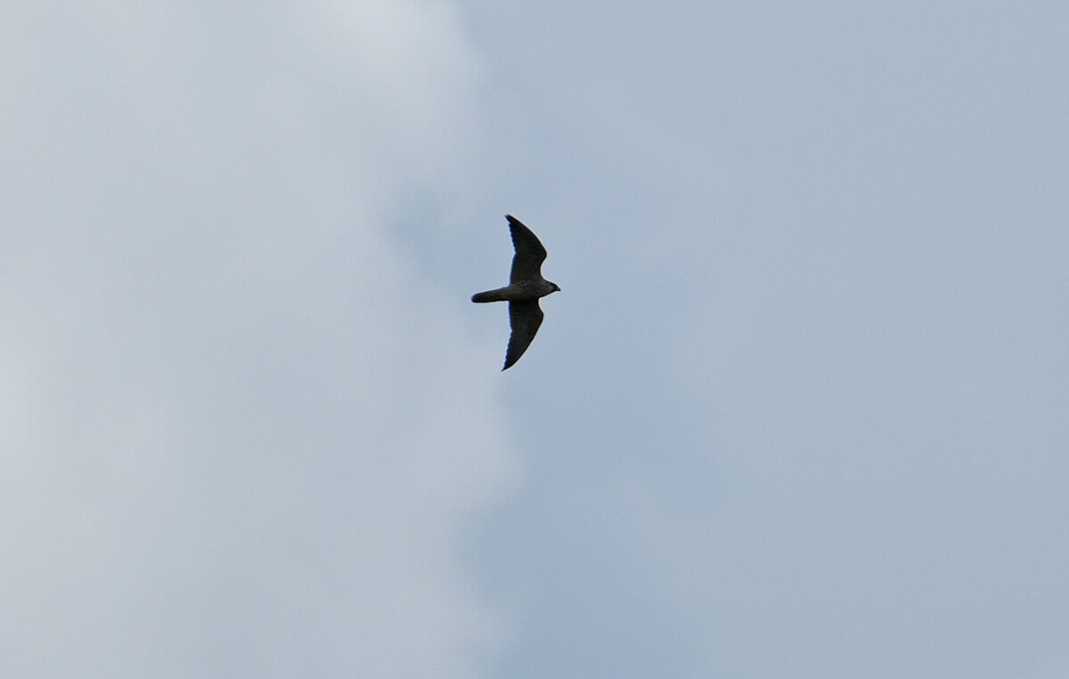 Een jonge Slechtvalk ving boven het verboden Dunea terrein een insect uit het vuistje. Wie goed kijkt kan nog net 2 vleugels onderscheiden