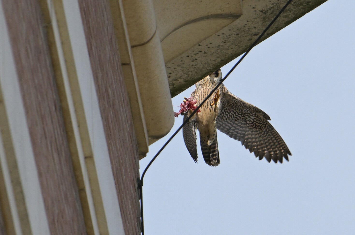 Ik ga er op de fiets achteraan en zie haar vanuit de Zwolsestraat met de prooi weer terug vliegen richting Watertoren :