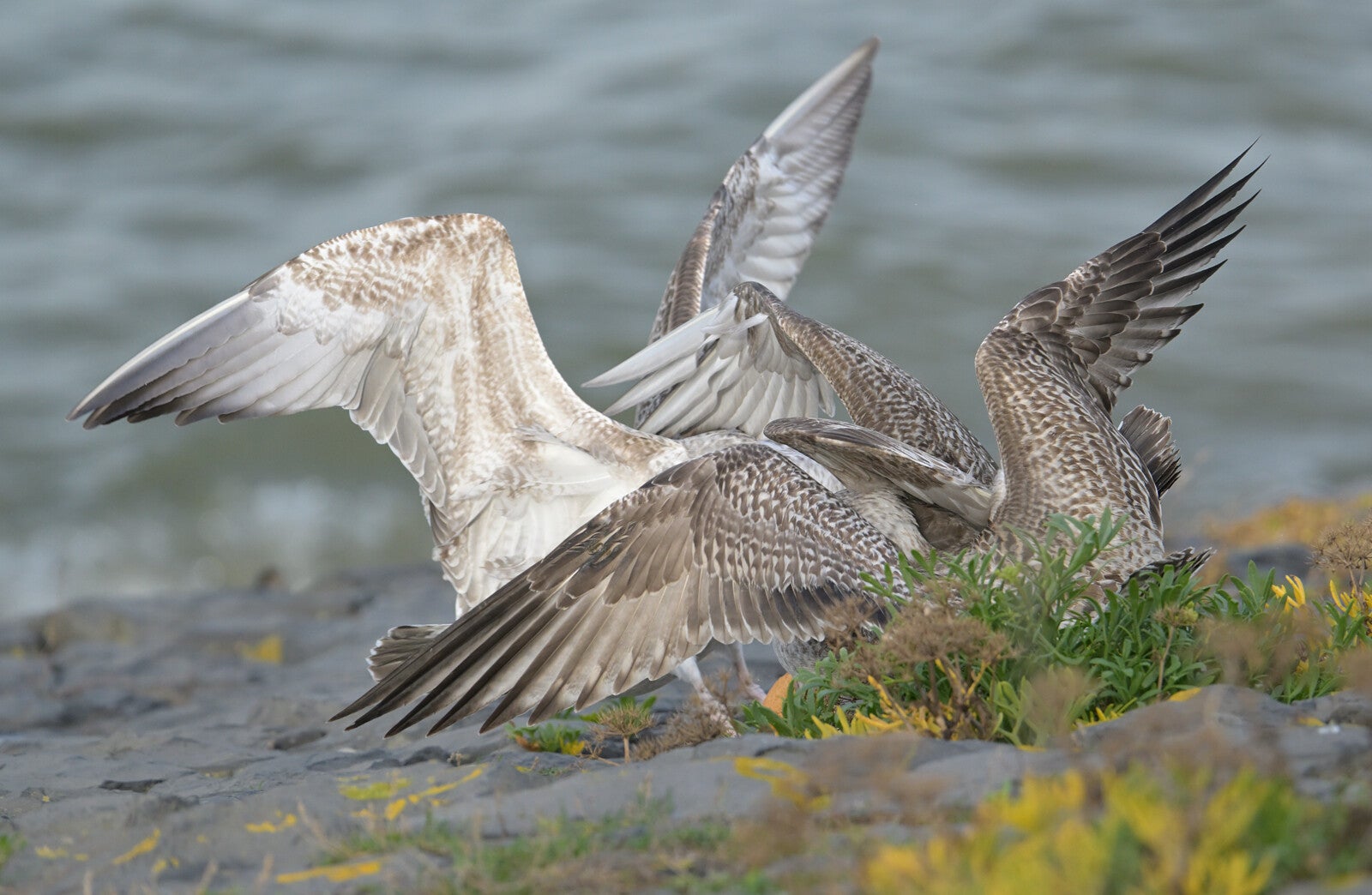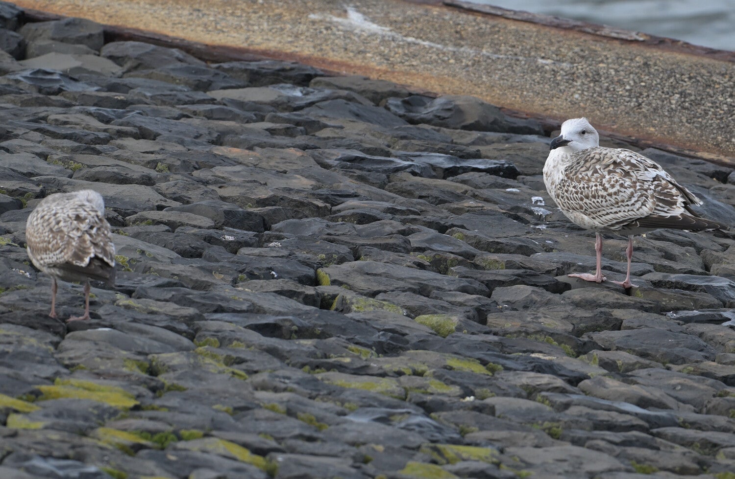 De jonge Grote Mantel links met rechts een jonge Zilvermeeuw :
