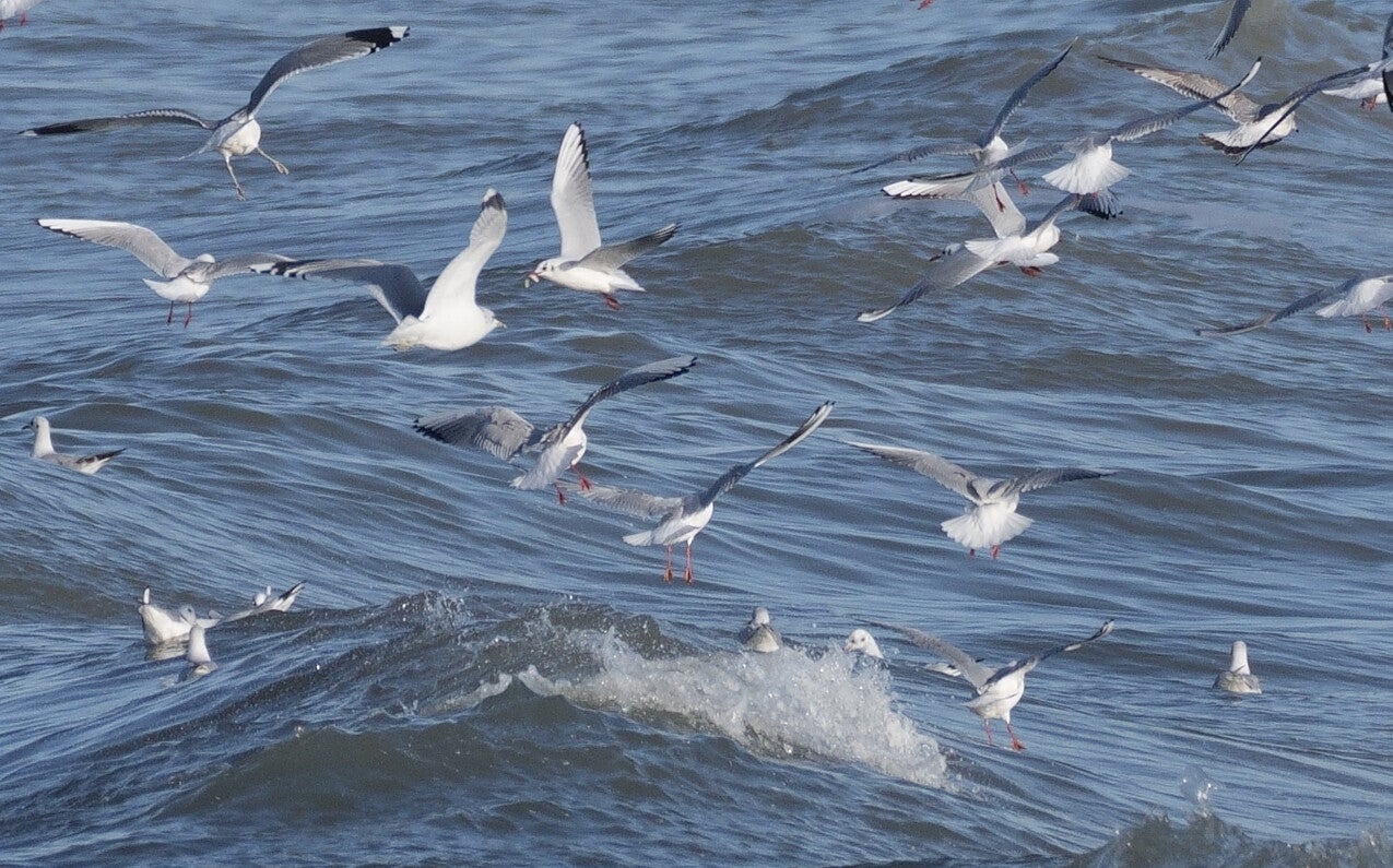 Op zee niets te beleven afgezien van de honderden Kokmeeuwen voor wie de zee nog steeds een luilekkerland is na de stormachtige periode :