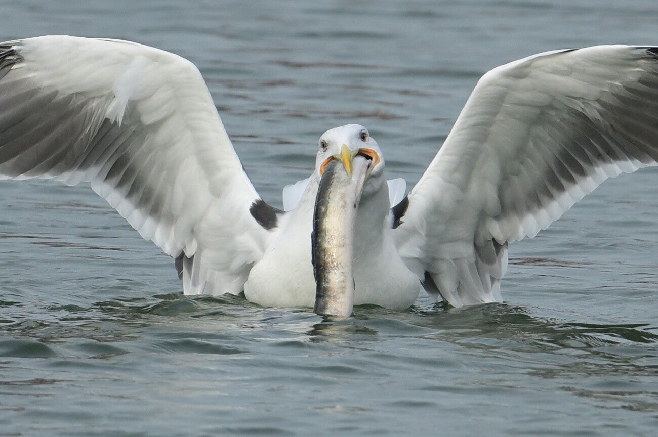 Vlakbij de jachthaven een Grote Mantelmeeuw met een onbekende grote Vis :