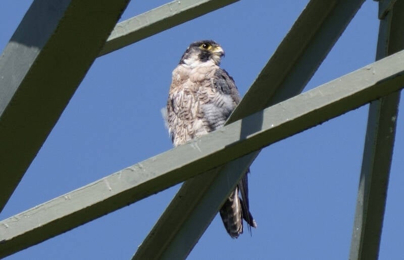 ...de nieuwkomer Slechtvalk weer te zien op mast 8, en die zit er gelukkig nog steeds als ik daar 5 minuten later arriveer :