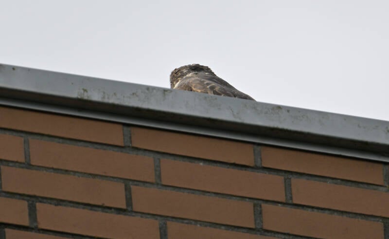 -Hij onderbreekt zijn maaltijd als ik naar boven tuur....Meestal trekken de Stadsvalken zich niets aan van Vogelaars.