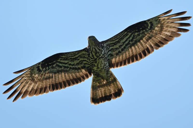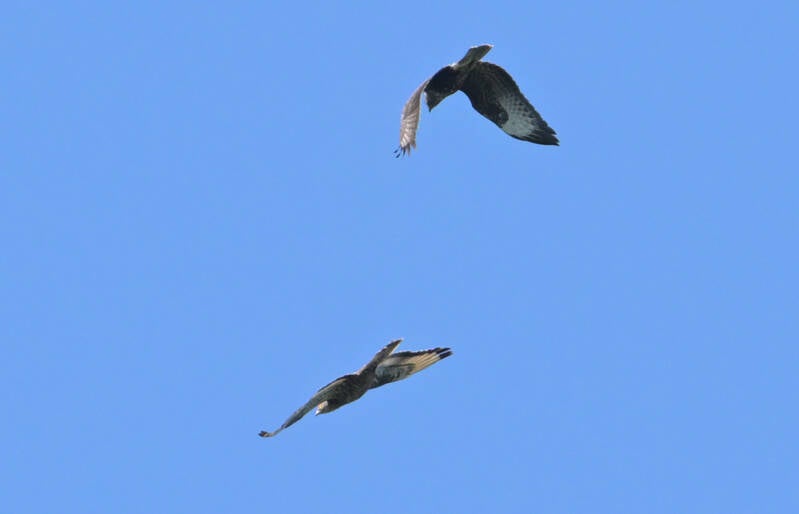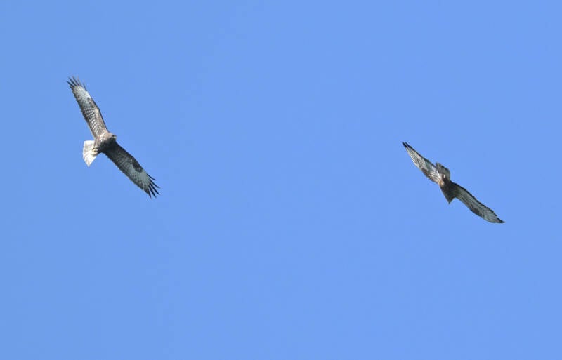 De Wespman vliegt even samen op met een jonge Buizerd...(Buizerd is bovenste vogel)