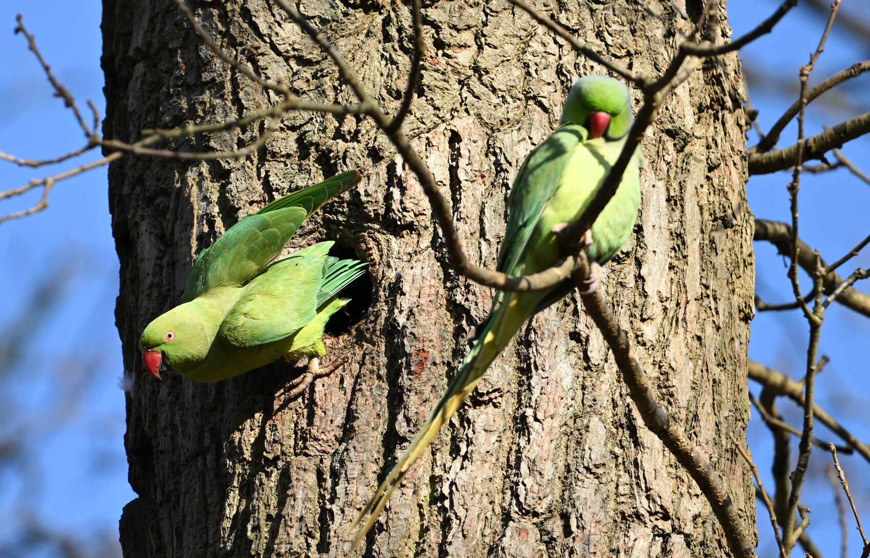 5 Februari : In de Scheveningse Bosjes inspecteert een paartje Halsbanden het nesthol van de vaste Boomklever en er zijn fraaie momenten
