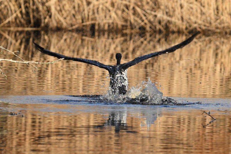 Het is rustig in de buurt van het picknickbankje en daarom laat ze zich ook duikend zien :