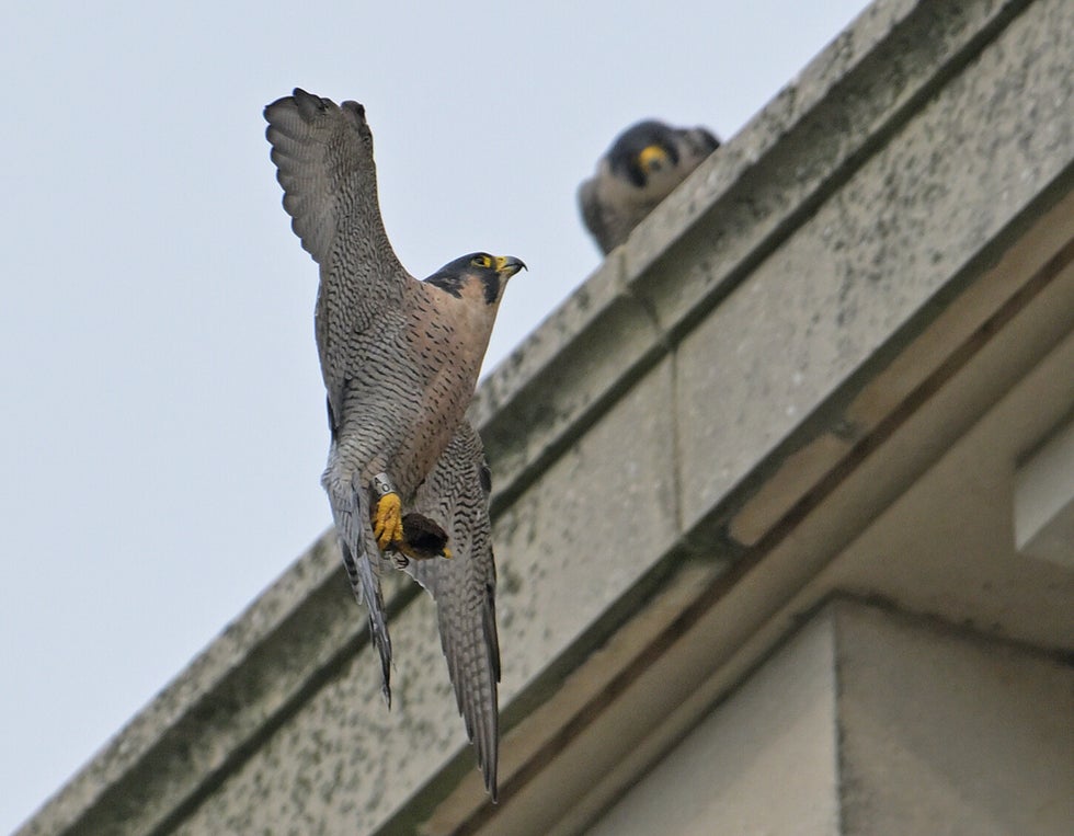 23 Oktober : Zware bewolking. Het echtpaar Slechtvalk zit er gezellig bij. Alo is kort weg en keert terug met een miniatuurprooi die ik aanvankelijk aanzie