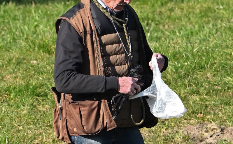 Een dode Kraai werd in de rondte geworpen om de Hond te trainen. Als de meneer me ziet gaat de dode Kraai snel in de tas...