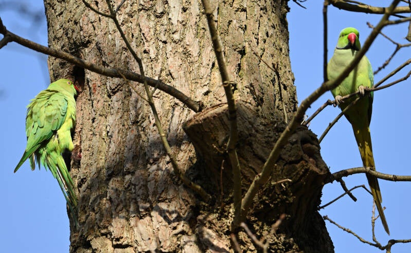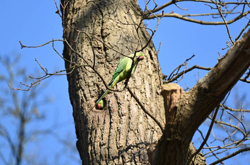 5 Februari : In de Scheveningse Bosjes inspecteert een paartje Halsbanden het nesthol van de vaste Boomklever en er zijn fraaie momenten