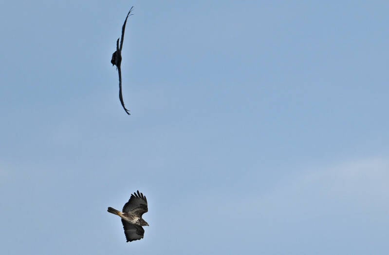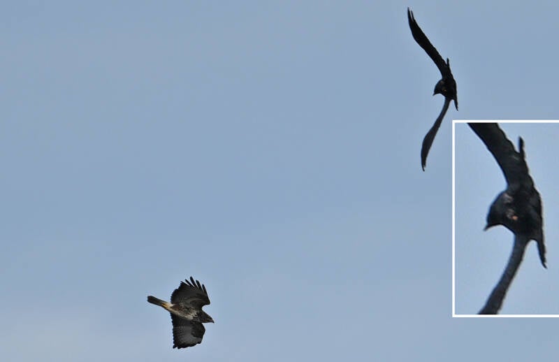 De gave Buizerd wordt steeds genegeerd, de staartloze Buizerd is schijnbaar favoriet bij de plagende Zwartkoppen..)