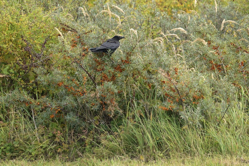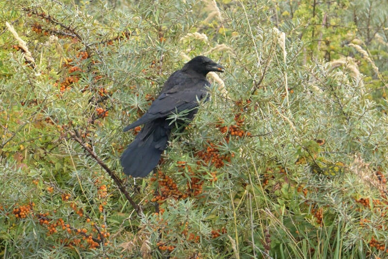 Kraai foeragerend op bessen Duindoorn :
