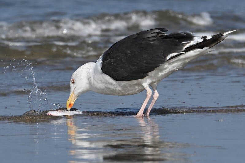 De volwassen Grote Mantelmeeuw heeft een platvis te pakken :