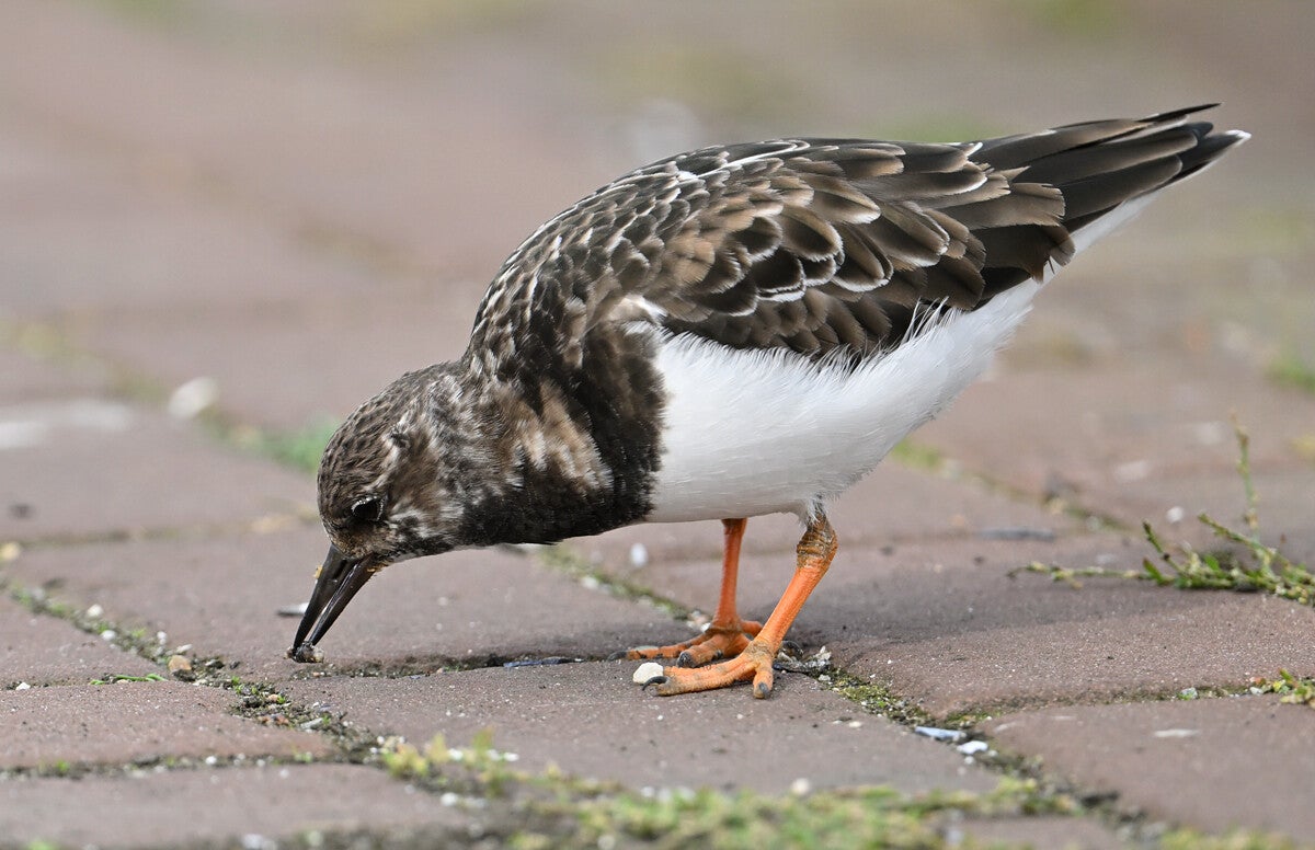 -Bontje heeft een onbekend schaaldier(?) in de snavel en zoekt een harde ondergrond om het kapot te gooien :