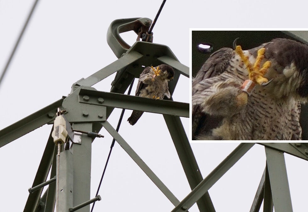 De indringer Valk laat hier nog even zien dat hij alleen aan de rechterpoot een aluminium ring draagt.