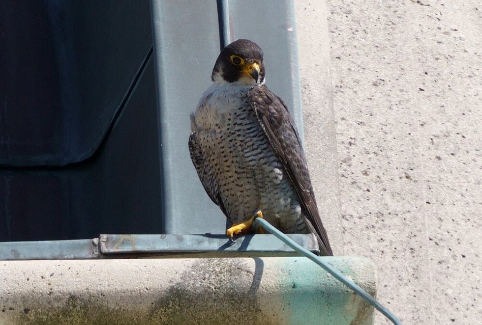 Hij strijkt nu echter neer boven het Dunea Logo. De jonge Valk is rechtsonder zichtbaar: