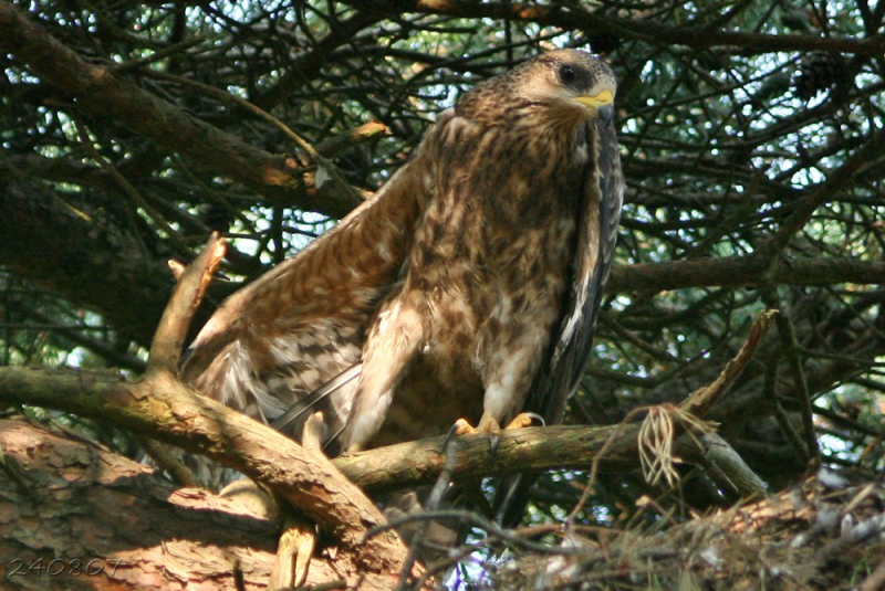 17 Augustus : Slechts enkele dagen later toont de jonge Wespendief wat meer van zichzelf. Leeftijd rond de 37 dagen.